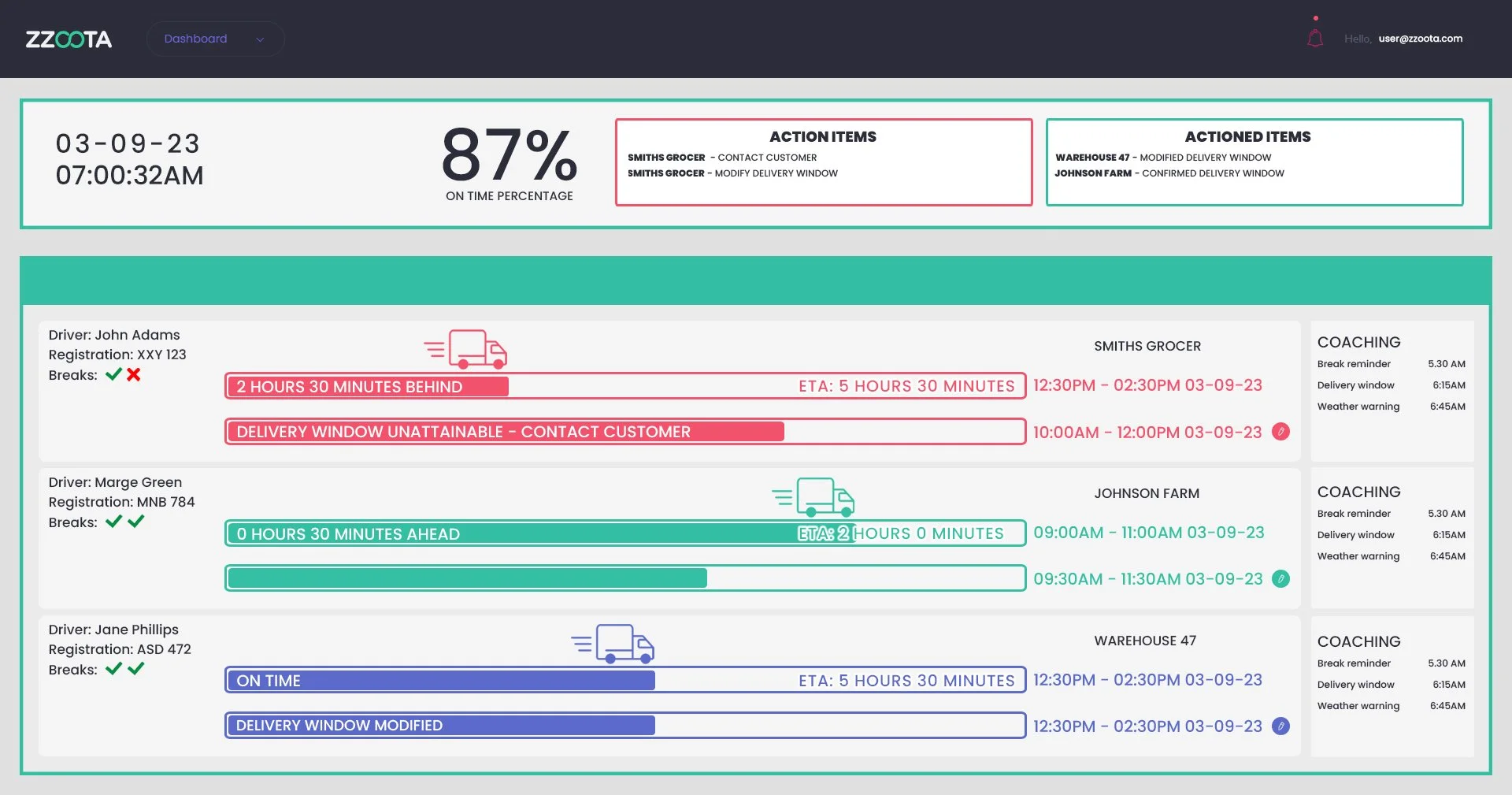 Long-haul driving is fraught with unpredictable elements like traffic, road works, weather conditions, and vehicle issues. These challenges often make it difficult for drivers to reach their destinations within the stipulated delivery window. Recognising this, zzoota has ingeniously developed a system that doesn't just provide a static plan but continuously adjusts to real-time conditions and provides dynamic coaching to drivers, ensuring timely deliveries.